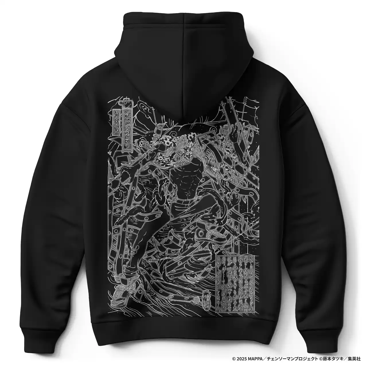 本商品は、シルクスクリーン印刷にて浮世絵の「墨線」と呼ばれる版木のラインを背面にプリントしています。フロントには浮世絵内で「チェンソーマン」を表現した「鎖鋸男」とポチタをデザインしています。 |