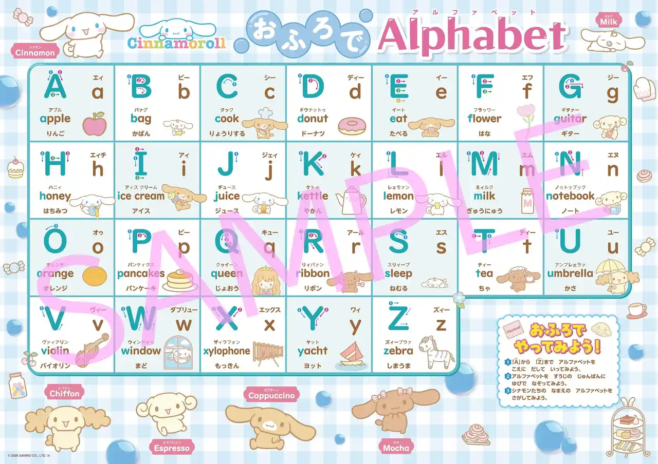シナモロールと一緒に、すうじとABCを楽しく学べるおふろポスターが10月15日に発売予定です。 |