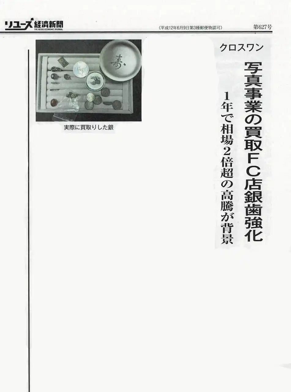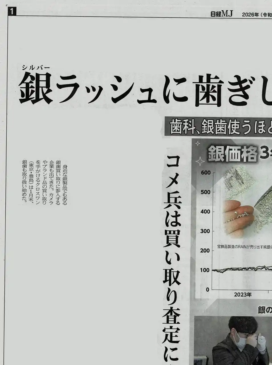 | 同社では、従来見過ごされがちであった銀歯や銀製品についても適正な価値評価を行う取り組みを進めており、その動きが注目され、流通・小売分野の専門紙「日本経済新聞MJ」および業界紙「リユース経済新聞」など複数媒体にて掲載・取材を受けました。 | |||||||||
