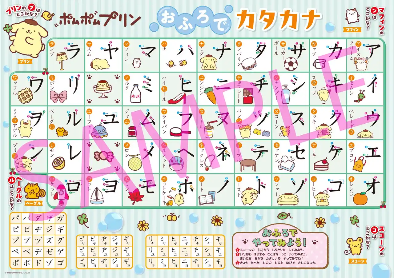 ポムポムプリンと一緒に、ひらがなとカタカナを楽しく学べるおふろポスターが10月15日に発売予定です。 |
