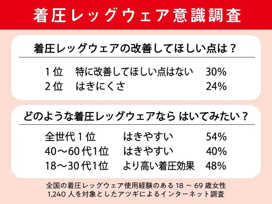 アツギが2024年4月に実施したインターネット調査によると、着圧レッグウェアの改善してほしい点として「特に改善してほしい点はない」に次いで「はきにくさ」が挙げられました。さらに、「どのような着圧レッグウェアならはいてみたいですか」という質問では「はきやすい」がトップという結果に。高い着圧値を求めながらも、着圧レッグウェア特有のはきにくさは、忙しい毎日の中で不便なポイントとして捉えられているようです。 |