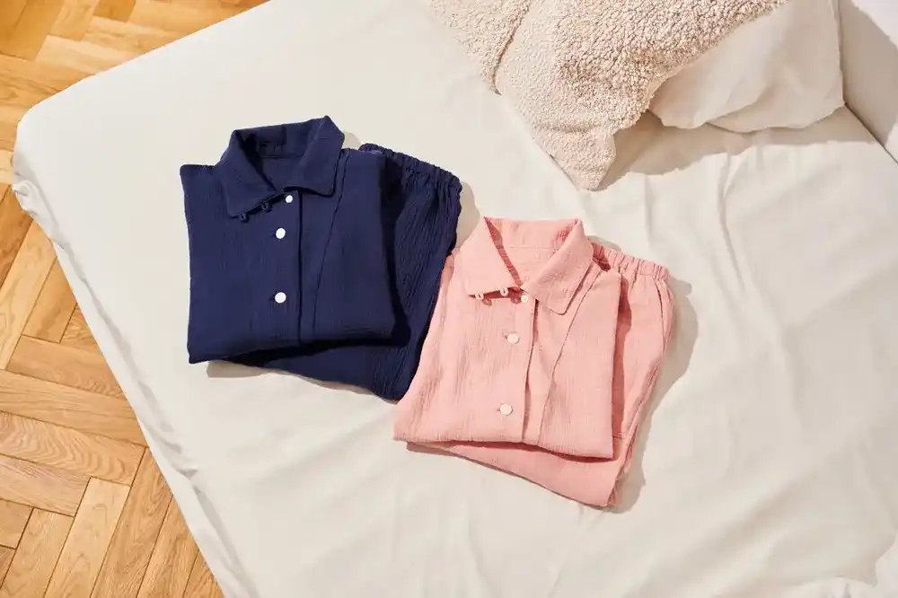 通気性・吸湿性に優れている着心地にこだわった柔かな天然コットン(綿)100%のガーゼ生地が特徴です。肌あたりのストレスに配慮した縫い目とアウトポケット仕様により、くつろぎやすさを考慮しております。 |