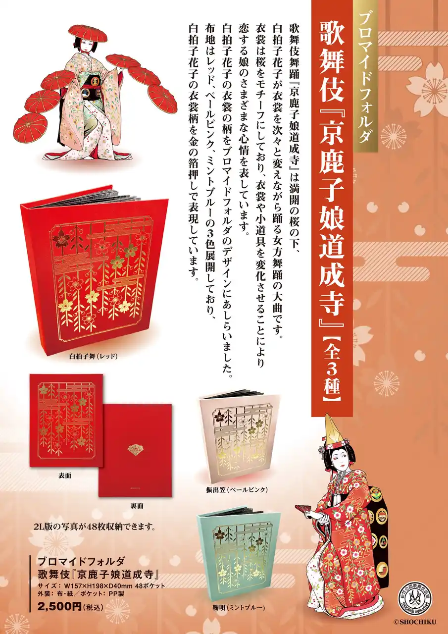 松竹株式会社(東京都中央区、代表取締役社長 高槗 敏弘) 事業推進部は、「ブロマイドフォルダ 歌舞伎『京鹿子娘道成寺』」(全3種)を、2026年3月24日(火)より松竹歌舞伎屋本舗にて発売開始いたします。 |