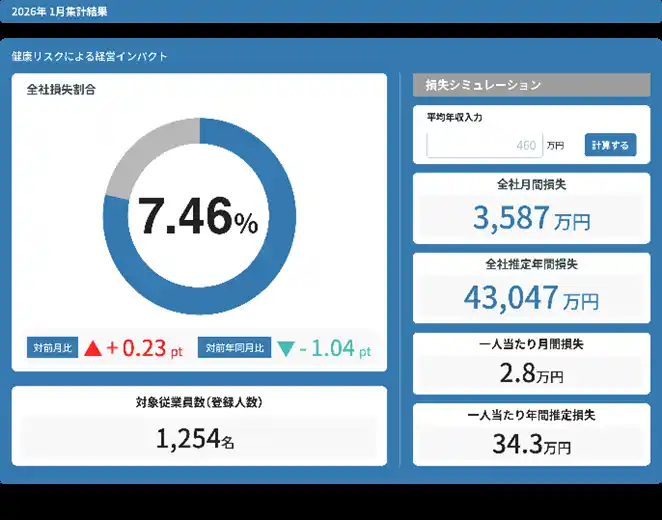 本プラットフォームでは、従業員の健康診断結果や、労働時間等の情報を一元管理すると共に、従業員が定期的に回答する問診(サーベイ)の結果を組み合わせることで、管理者が、組織別の健康リスクやプレゼンティーズム※等による経済損失額の閲覧が可能になると共に、パフォーマンス阻害要因の分析等も行いやすくなります。 |