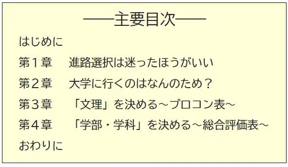 | そこで、『ミライの選択』開発チームは、中高生やその保護者が進路について「しっかりと考えて決める方法」を学び、納得のいく進路選択の支援をするため、書籍を刊行しました。本書は、進路選択に悩む高校1年生の少女が決め方を身につける過程を描いた漫画とともに、理論を分かりやすくかみ砕いた解説を併記しており、中高生にとって親しみやすい構成になっています。保護者の方にもお読みいただくことで、子どもが大切にしたいことを親子で共有し、真に希望する進路を後押しするきっかけとしてご活用いただけます。 | |||||||||||||||||||||||