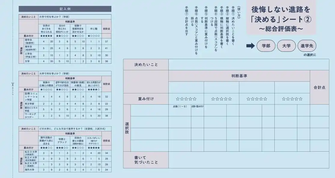 | さらに巻頭には、付録として「後悔しない進路を決めるシート1.プロコン表」「後悔しない進路を決めるシート1.総合評価表」を収録しています。本著を読み終えた中高生が「書いてみよう!」とすぐに実践できる、実用的な仕掛けです。 | |||||||||||||||||||||||