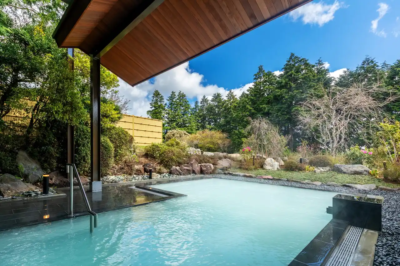 湯ノ花沢温泉は、駒ヶ岳東斜面の海抜約950m地点、箱根十七湯の中では最も高い位置にあります。箱根でも希少な乳白色のにごり湯は発汗作用があり、湯冷めしにくく美肌の湯として評判です。当ホテルで提供するのは地熱蒸気を利用した「蒸気井(じょうきせい)造成温泉」です。孔底350mから噴出する 180°の蒸気は蒸気井(地熱蒸気の井戸)を通って湯畑で沢水と掛け合わせて60°の温泉を造成します。 |
