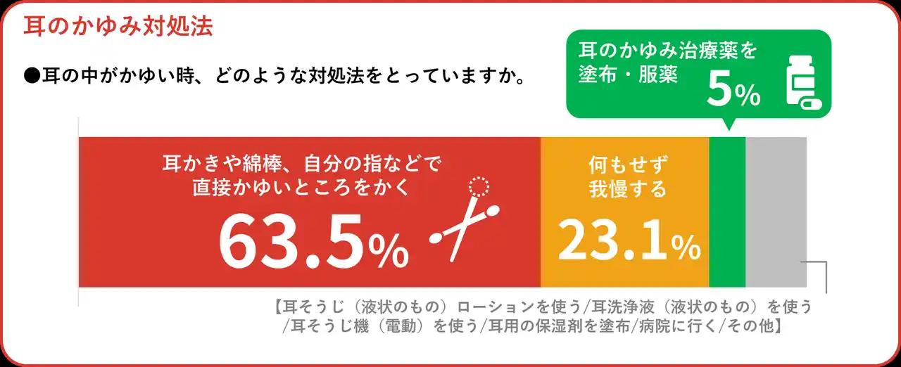 一方「耳のかゆみ治療薬を塗布」3.9%、「耳のかゆみ治療薬を服薬」1.0%と、治療薬の使用は約5%にとどまり※4、対処としては綿棒や耳かきでかく、我慢する人が多く、専門薬を使っていない人が多い。 |