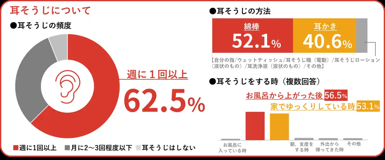 普段の耳そうじの頻度については、週に1回以上耳そうじを行っている人は62.5%と6割以上※1を占める。普段の耳そうじ方法では「綿棒」52.1%、「耳かき」40.6%と合わせて9割※2にのぼり、ほとんどが綿棒・耳かきのいずれかで耳そうじを行っている結果に。 |