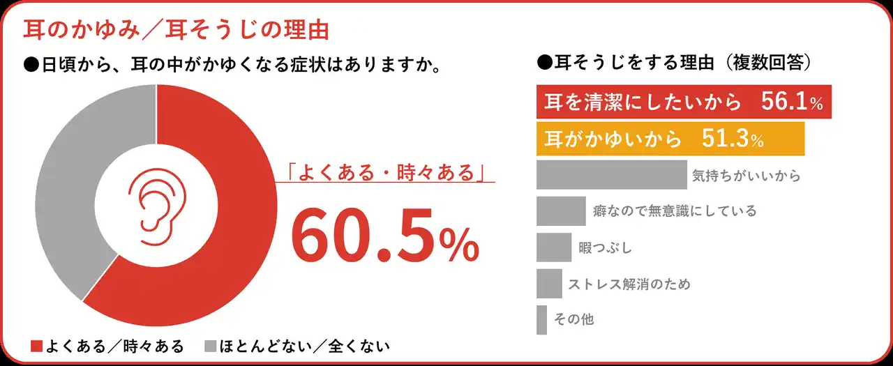 また耳そうじをする理由では、複数回答で「耳を清潔にしたいから」56.1%に続き、「耳がかゆいから」が51.3%となり、半数以上※3が耳のかゆみをきっかけに耳そうじを行っている結果となった。 |