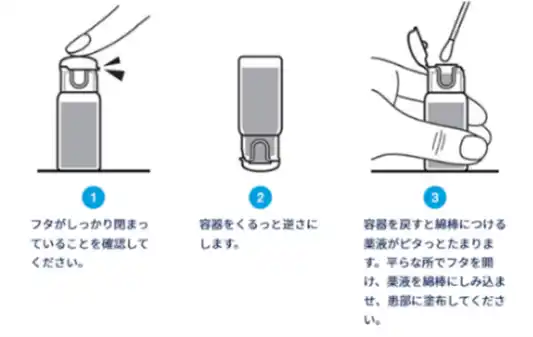 使い方は簡単です。まず、フタが閉まった状態で容器をくるっとひっくり返します。容器を戻してフタを開けると薬液がたまっています。清潔な綿棒に薬液をしみ込ませ、耳の入り口付近にやさしく塗布してください。耳の奥まで綿棒を入れないことが大切です。 |