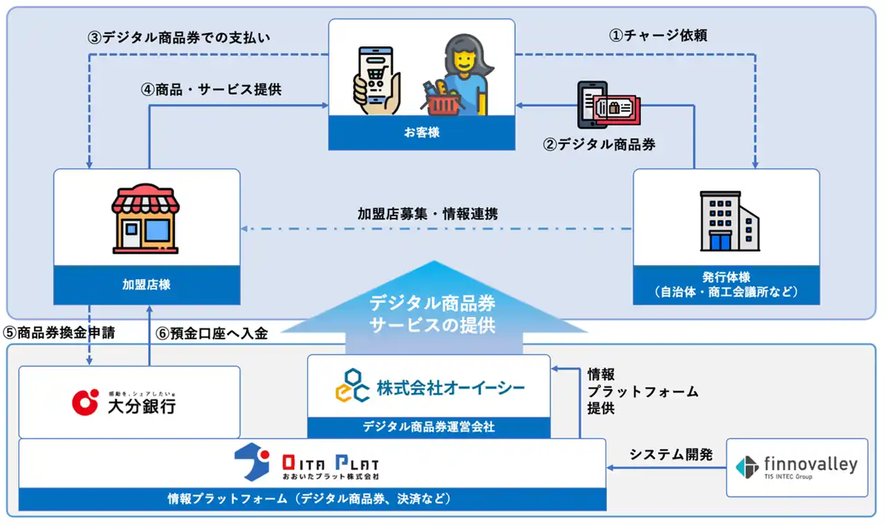 | 株式会社オーイーシー(代表取締役社長 加藤 健)は、おおいたプラット株式会社(代表取締役社長 上野 秀寿)と株式会社フィノバレー(代表取締役社長 川田 修平)の電子地域通貨プラットフォームを活用した、「デジタル商品券 発行スキーム」が、2026年6月1日から利用開始される「大分市プレミアム付き商品券事業」(実施主体:大分商工会議所)に採択されたことをお知らせします。 | |||||||||||||||
