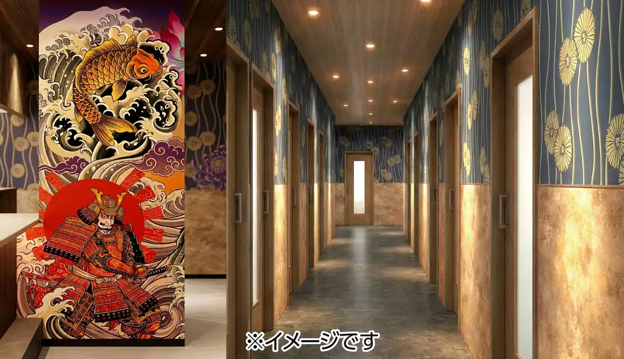 カウンター近くの柱には、鯉と武士をダイナミックに描いた和モダンなアートが施され、和の美しさと力強さを感じられるデザインとなっています。 |