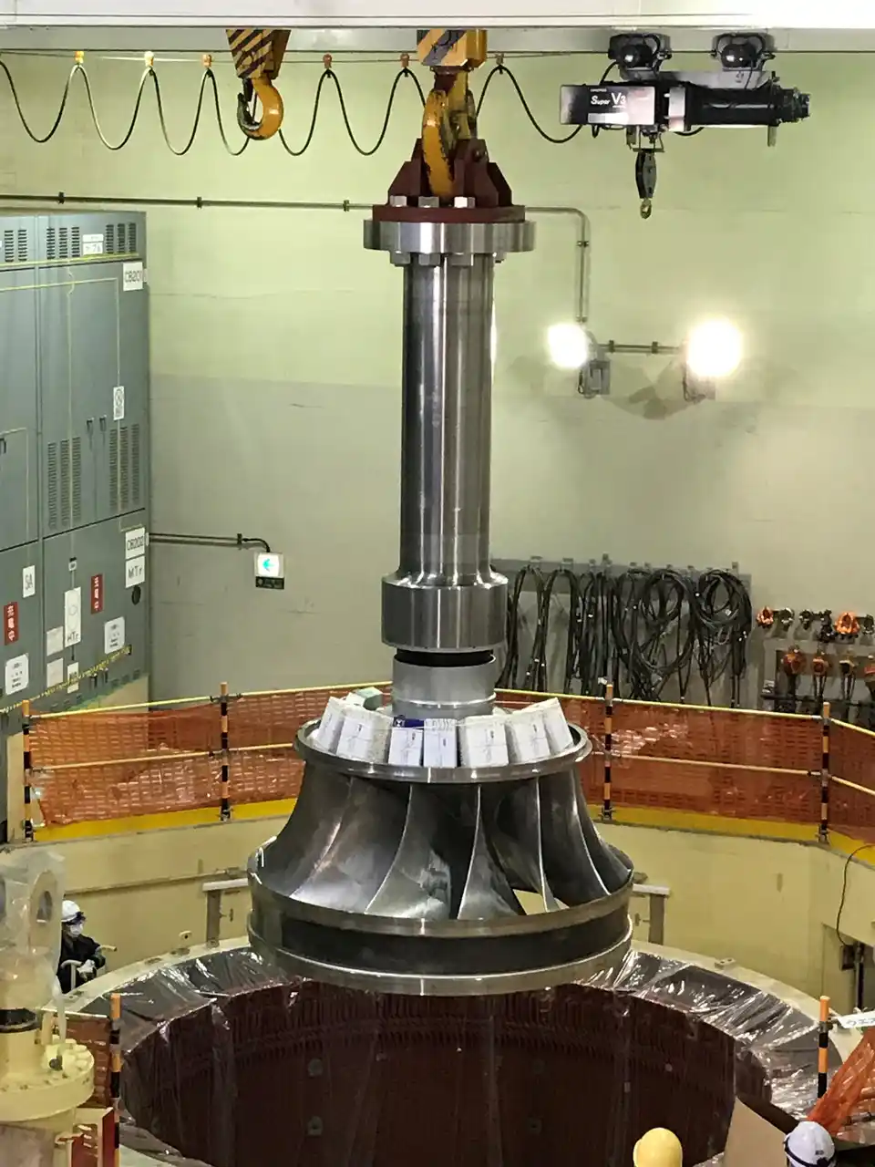 | 本更新では、コンピューターを用いて水車内部における水の立体的な流れをシミュレーションする技術を利用し、翼形状を最適化した水車ランナを適用しました。また、主要変圧器の容量を44,000kVAから46,000kVAへ増強しました。これにより、水車発電機のエネルギー変換効率が向上し、許可された水利使用条件(水車の落差や最大使用水量)を変更せずに発電出力を1,200kW増加させることが可能となりました。 | ||||||||||