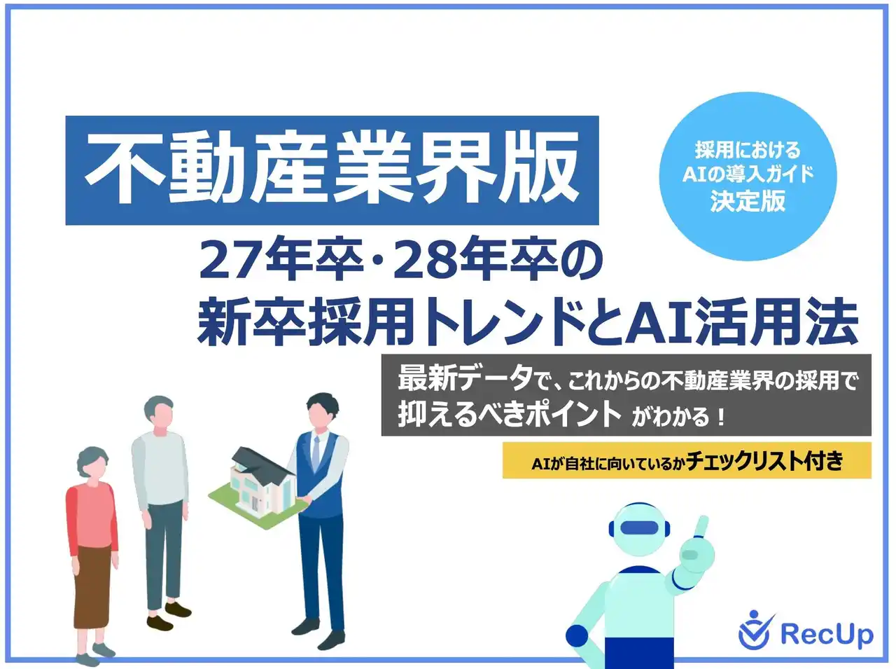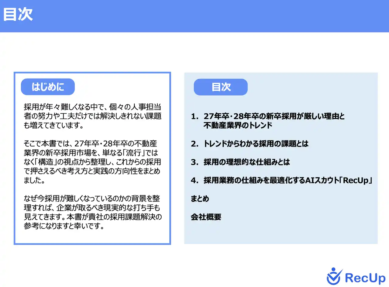 本資料では、激化する不動産業界の新卒採用市場において、いま選ばれる企業は何が違うのか。RecUp導入企業が実践する、最新トレンドを捉えた戦略的スカウト運用の全容を公開します。 |