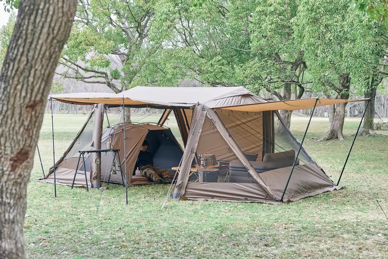 景色を楽しむ日はフルオープン、虫が多く気になる日はフルメッシュ、おこもりキャンプをする際はフルクローズなど、AIR VISTAはオールシーズンどんな場面でも使いやすいテントを目指しました。 |