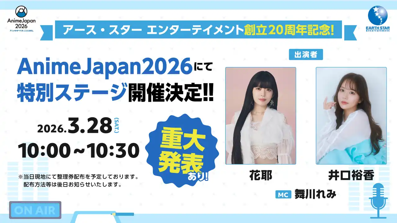 | 株式会社アース・スター エンターテイメント(本社:東京都品川区、代表取締役社長:幕内和博)は、2026年3月28日(土)、29日(日)に東京ビッグサイトにて開催される「AnimeJapan 2026」へ出展いたします。 | ||||||||||||||