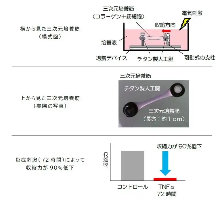 筋細胞から作った生体に近い「三次元培養筋」を用いた研究で、炎症により筋力が低下する仕組みの一端を解明 |