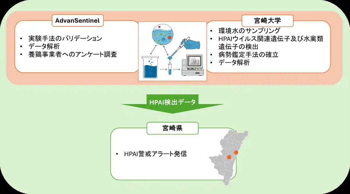 昨シーズンでは宮崎をフィールドとしたAdvanSentinel社との共同研究により、カモ等の渡り鳥が飛来する貯水池等の環境水でHPAIウイルスの県内侵入のモニタリングが可能なことが確認できました。さらにその警戒アラート発信への利用可能性についても確認されて、今シーズンは宮崎県の協力も得て本システムの概念実証の実施する次のステージに至りました。