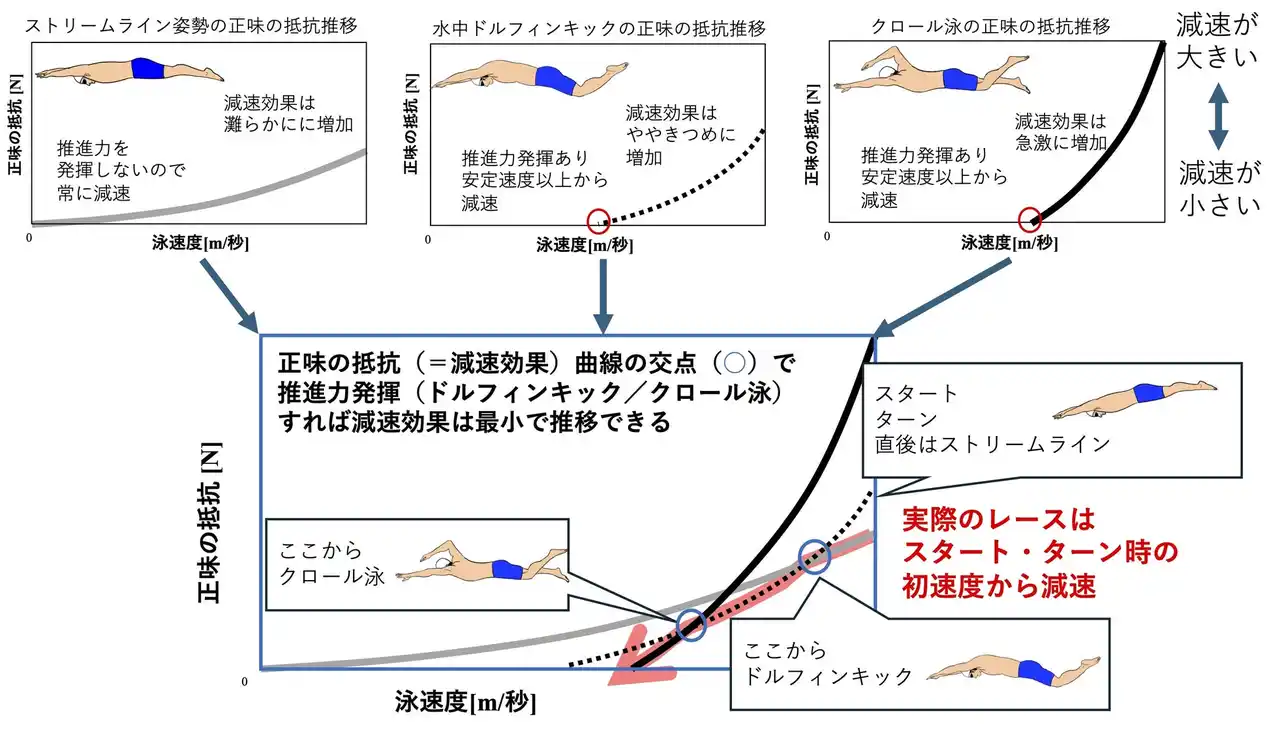ストリームライン姿勢、水中ドルフィンキック、クロール泳の3つの姿勢・動作について、高速度域の正味の抵抗曲線(推進力によって相殺される減速効果量)が明らかになった。これらの曲線の交点で推進動作(水中ドルフィンキック/クロール泳)を開始することで減速効果の最小化が実現できる。 |