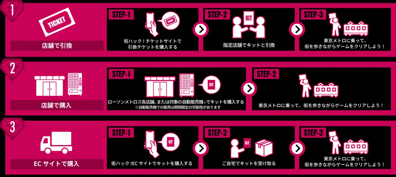 1 メトロタイムゲート ルビーエクスプレスサイト(https://metrotimegate.com/v3#howtobuy)から該当商品の街ハック!チケットサイトへアクセス。 |