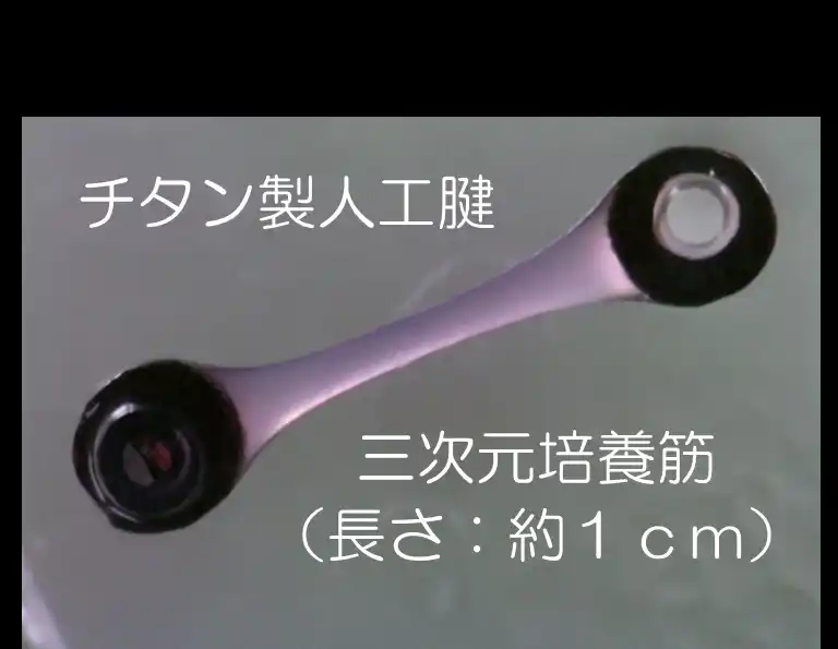筋細胞を立体的に培養し、人工腱で張力をかけることで生体に近い構造と機能を再現した人工筋組織。電気刺激により実際に収縮し、その収縮力を定量的に評価できる。 |