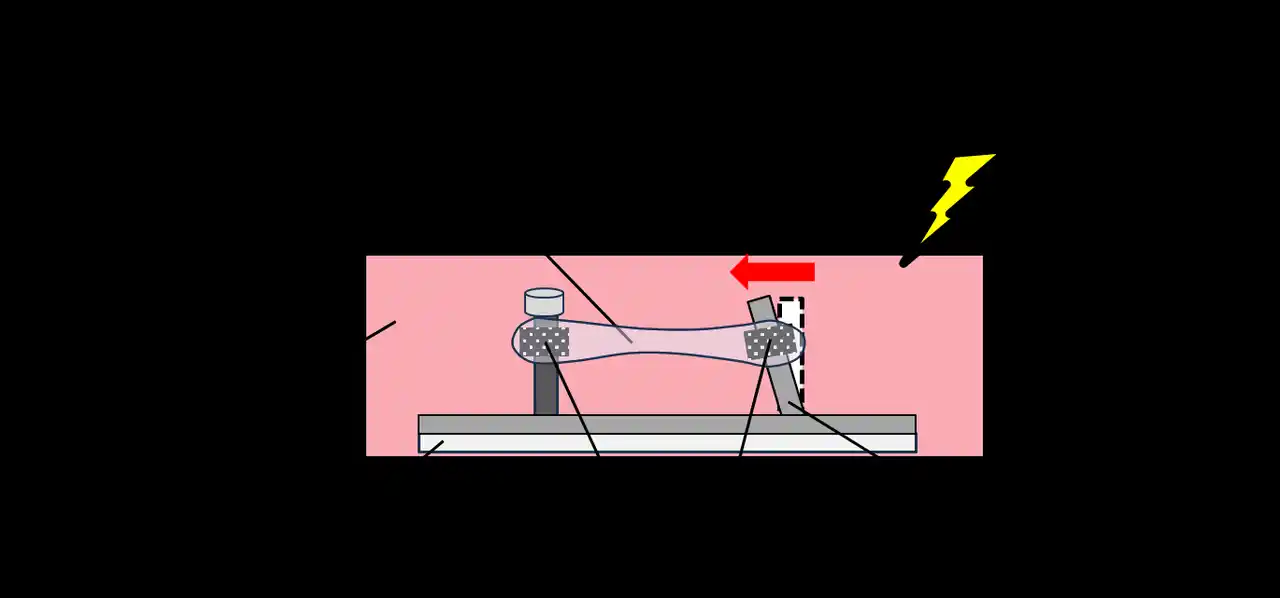 コラーゲン中で立体的に培養し、人工腱で固定した三次元培養筋は、電気刺激により実際に収縮する。炎症性物質 TNF-αの作用により、収縮力は著しく低下する(約90%低下)。 |
