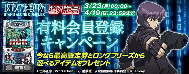| 上記期間中に有料会員登録をしていただいた方を対象に、「スマスロ 攻殻機動隊」のロングフリーズから遊べるアイテムと最高設定券をもれなくプレゼント! | |||||||||||||