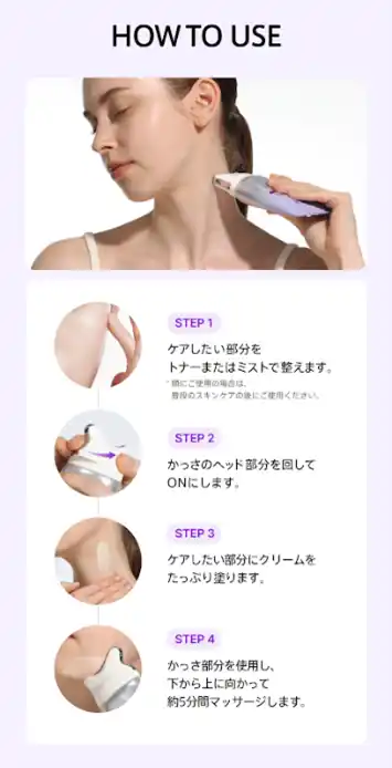 ワイド設計のヘッドが気になる部分に密着し、クリームをなじませながらスムーズにケア。日々のスキンケアに取り入れることで、フェイスラインから首元までトータルにケアできます。 |