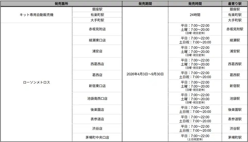 | ※発売箇所や営業時間は変更となる場合がございます。 | |||||||||||||||