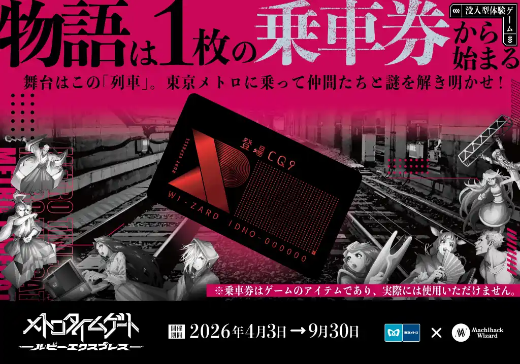 | 東京地下鉄株式会社(本社:東京都台東区、代表取締役社長:小坂 彰洋、以下「東京メトロ」)は、地域コンテンツを軸にした体験型サービス「街ハック!」を展開する株式会社休日ハック(本社:東京都台東区、代表取締役社長:田中 和貴、以下「休日ハック」)と共同で、没入型体験ゲーム『メトロタイムゲート』の完全新作となる「ルビーエクスプレス」編を、2026年4月3日(金)から同年9月30日(水)の間、期間限定で開催します。 | |||||||||||||||