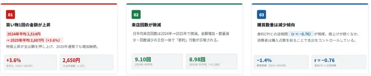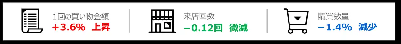 近年の物価上昇を背景に、食料品スーパーマーケットにおける「1回の買い物金額」「購買数量」「来店回数」の推移に着目し、2024年から2025年までの購買データを分析しました。その結果、1回あたりの買い物金額は継続的に上昇する一方、購買数量や来店回数は微減する傾向が見られ、生活者の買い物スタイルに変化が起きている可能性があることが明らかになりました。 |