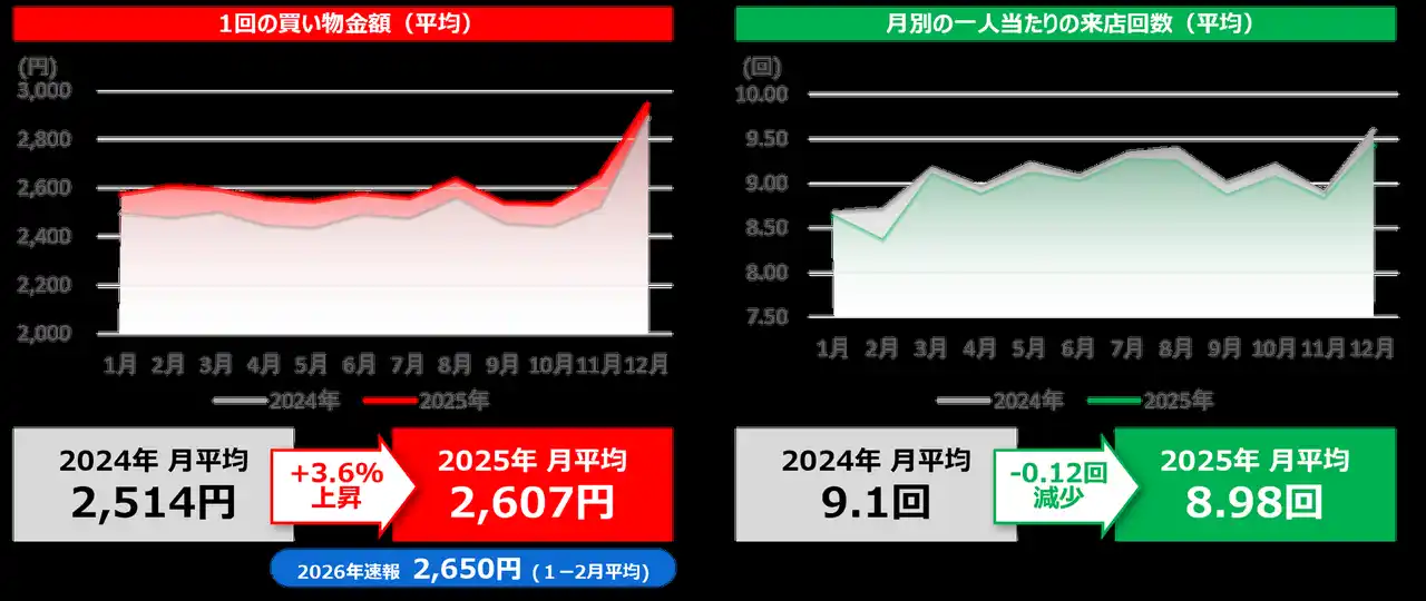 特に食料品スーパーマーケットでの1回の買い物金額は2024年平均2,514円から2025年平均2,607円へと増加し、前年比+3.6%の上昇が確認されています。さらに2026年1~2月の速報値では平均2,650円となり、前年を上回る水準を維持しています。物価上昇の影響を受け、1回あたりの支出額が押し上げられていると考えられます。一方で、月平均の来店回数は2024年9.1回から2025年8.98回へとわずかに減少しており、来店回数を抑えながら買い物をすることが広がりつつある可能性が示唆されています。 |