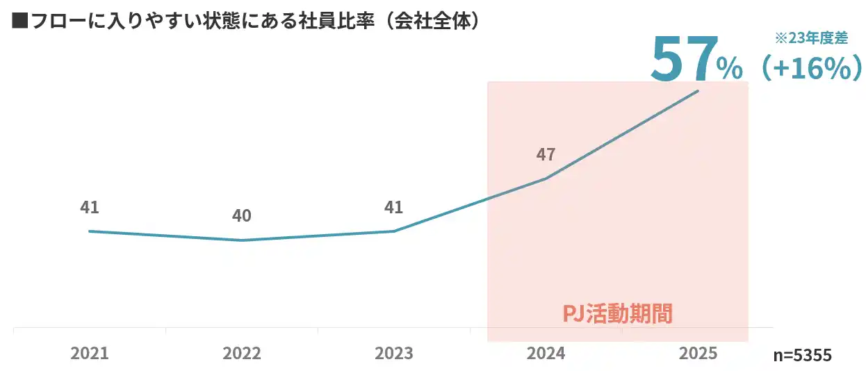 各職場において仮説検証をくり返したことで、創造力を全開にし、新たな物事に挑戦するマインドの高い職場づくりを成功させる鍵は「いかにフローに入る要素を本業へ組み込めるか」であることが判明。プロジェクトメンバーが中心となり、各職場で自分自身の業務と会社のめざす姿のつながりを理解する取り組みや、個人の成長実感につながる業務習得体制の見直しなどに取り組みました。また、フロー状態に入るための阻害要因となっている課題に向き合い、業務の取捨選択などを継続して行った結果、全社のフロー比率もプロジェクト発足前の41%から57%まで大きく伸長しています。 |