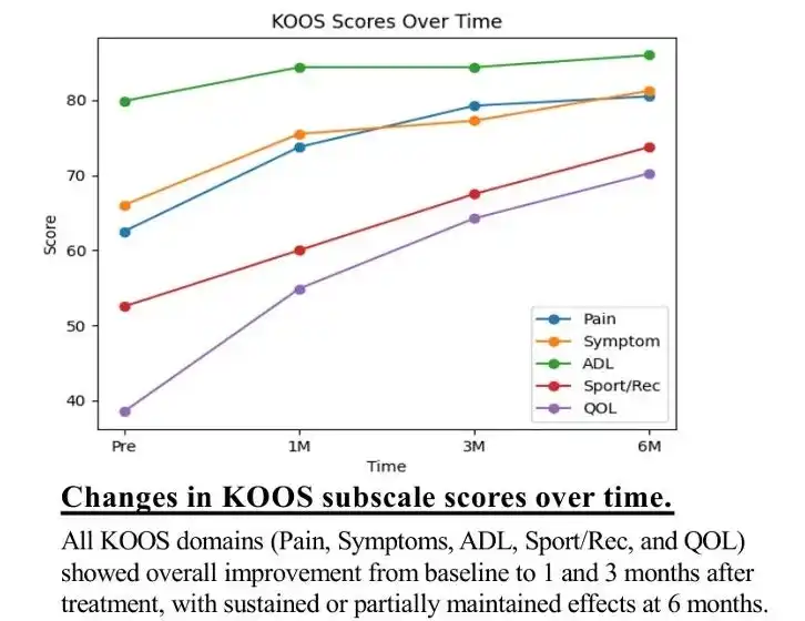 KOOS(膝障害・骨関節炎アウトカムスコア)においてPain・Symptoms・ADL・Sport/Rec・QOLの全5ドメインで、治療前から投与後1ヶ月・3ヶ月にかけて改善傾向が確認され、6ヶ月時点でも効果の持続または部分的維持が示されました。 |