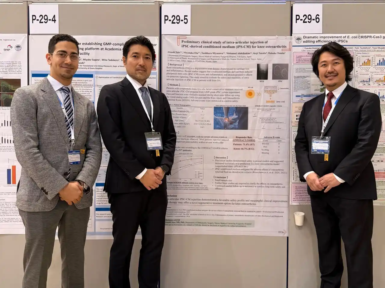 ミライズiPSクリニック(所在地:東京都港区、代表:富田大介)をはじめとするミライズウェルメディカルグループ(事務局:株式会社メディデント)、昭和医科大学藤が丘病院整形外科(講師:佐藤敦)、日本医科大学形成外科・再生医療科(Mohamed Abdelhakim)、アイ・ピース株式会社(iPEACE Inc.)(CEO:田邊剛士、本社:米国カリフォルニア州パロアルト/日本子会社:京都府)による国内外4機関の共同研究チームは、第25回日本再生医療学会総会(神戸、3月19~20日)において、iPS細胞由来培養上清(iPSC-CM)を変形性膝関節症患者の膝関節内に投与する世界初の可能性がある先駆的臨床研究の成果を発表しました。 |
