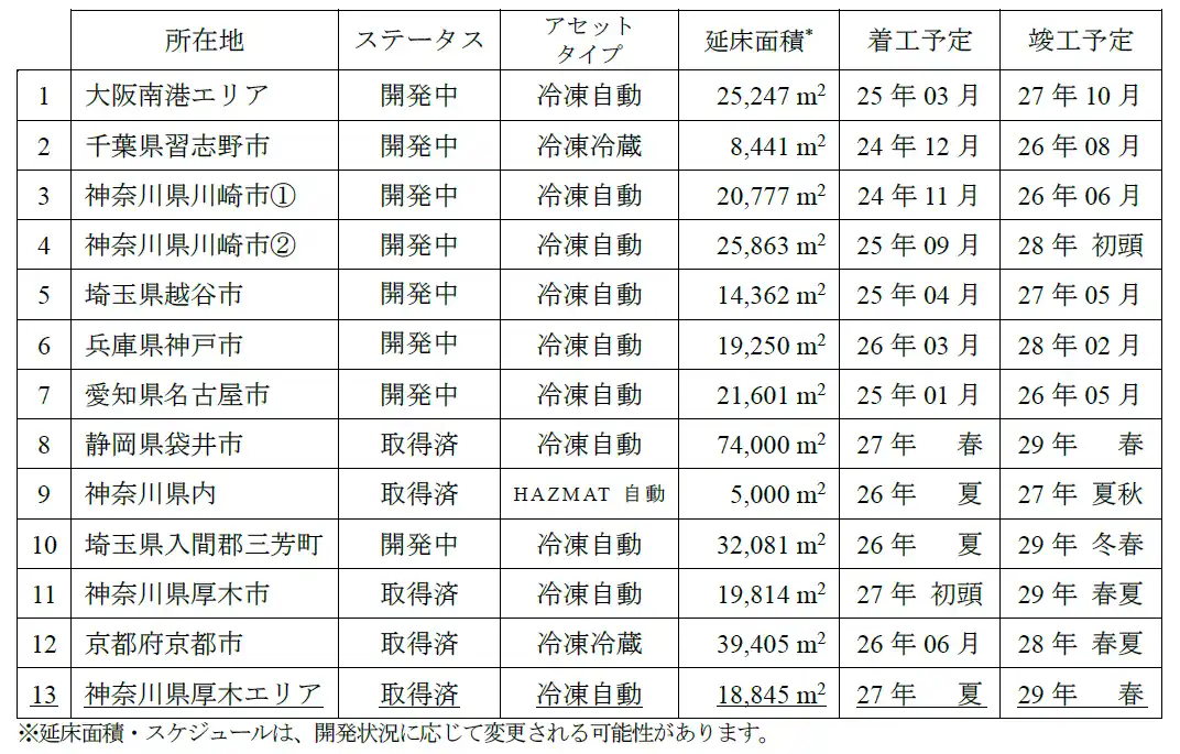 | 当社は、2030年のフロン規制に向けた冷凍冷蔵倉庫の設備投資、冷凍食品の消費増加による冷凍冷蔵倉庫の需要拡大、および2024年問題に起因する労働力不足、就業者の高齢化等の物流業界の課題に対応すべく、冷凍冷蔵倉庫および冷凍自動倉庫の開発をおこなっております。このたび、当社の物流施設ブランド『LOGI FLAG』の開発用地を、新たに販売用不動産として取得いたしました。 | ||||||