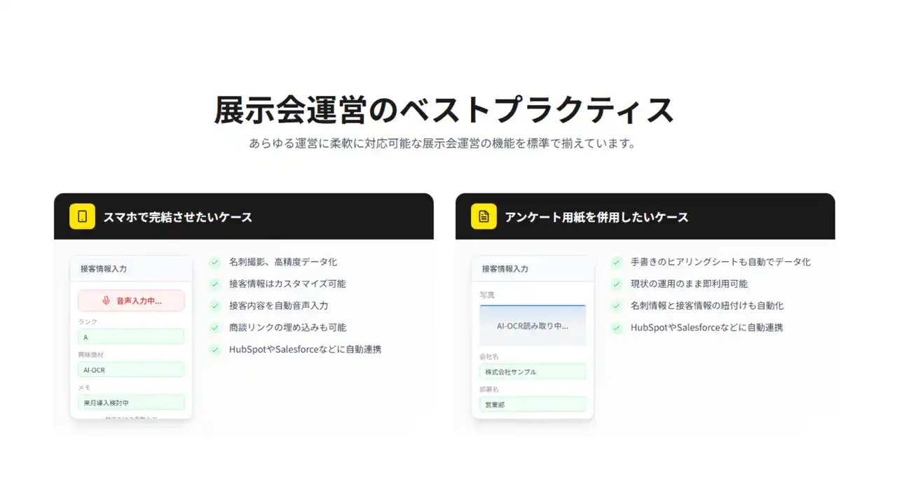従来の展示会運営では、獲得した名刺やヒアリングシートを会期終了後に社内へ持ち帰り、データ化を経て営業担当へ割り振るまでに数日~1週間程度のタイムラグが生じることが一般的でした。 |