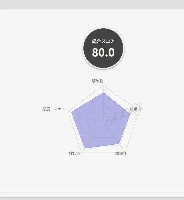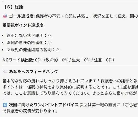 AIキャラクターとの対話後、対話内容をもとに、受講者との発話量の比率、NGワードの発言回数、語彙のバリエーション数などを測定します。その後、清香会が実際の保育現場で活用している教育指針や人事評価表などをもとに作成した評価軸により、利用した保育士の対応の特徴を100点満点で採点します。 |