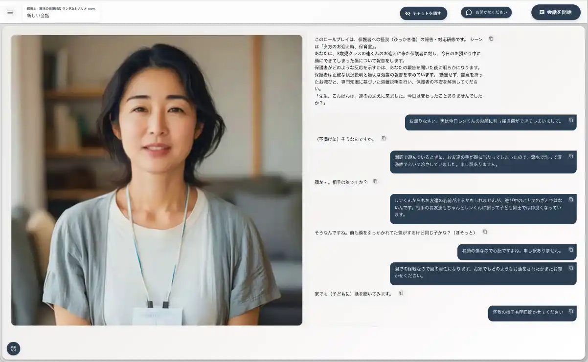 清香会がシナリオ作成の監修を行い、PCやタブレット上で、保育士が保護者の悩み相談にのる際のシーンや子どもとの対話のシーンなど代表的な保育スキルに関わるシーンを再現します。本システムを利用する保育士は、その中でAIキャラクターの保護者や子どもと対話を行うことができます。導入先のニーズに応じてシチュエーションを柔軟に変更できるほか、同じ場面でも異なる性格のAIキャラクターがランダムに登場することで、対話のゴールは毎回変化し、効率的にあらゆるシーンを経験することが可能です。 |