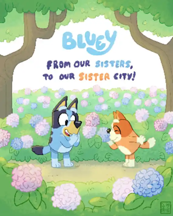 「From our sisters,To our sister city!」(ブルーイ・ビンゴ姉妹より、姉妹都市神戸へ) |
