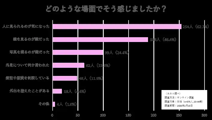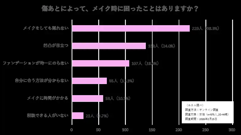 ユネルは2026年2月15日、20~44歳の女性1,388名を対象に、顔の傷跡に関する実態調査を実施しました。そこから、顔の傷跡が単なる外見の問題を超えて、深刻な心理的・行動的ハードルになっている実態が明らかになりました。 |