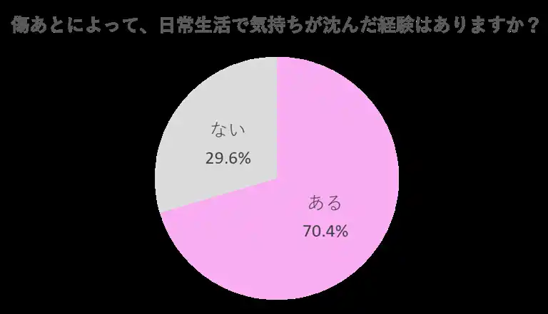 傷跡を持つ女性のうち70.4%が「傷跡によって日常生活で気持ちが沈んだことがある」と回答。具体的な場面を聞くと、「人に見られるのが気になった」(62.7%)、「鏡を見るのが嫌だった」(46.4%)、「写真を撮るのが嫌だった」(24.4%)、「外見について何か言われた」(15.3%)と続き、外見への悩みが行動や自己表現にまで影響している実態が浮かび上がりました。 |