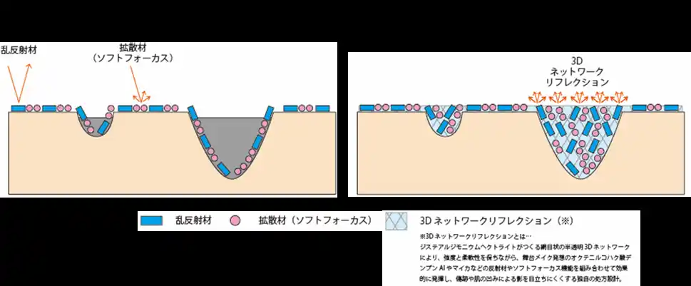 これにより凹みによって生じる影を目立ちにくくし、肌の凹みを自然になじませたような仕上がりを目指します。舞台メイクの光学補整の発想を応用したこのアプローチにより、従来のメイクではカバーが難しかった凹み傷跡にも対応し、自然な見た目をサポートします。 |