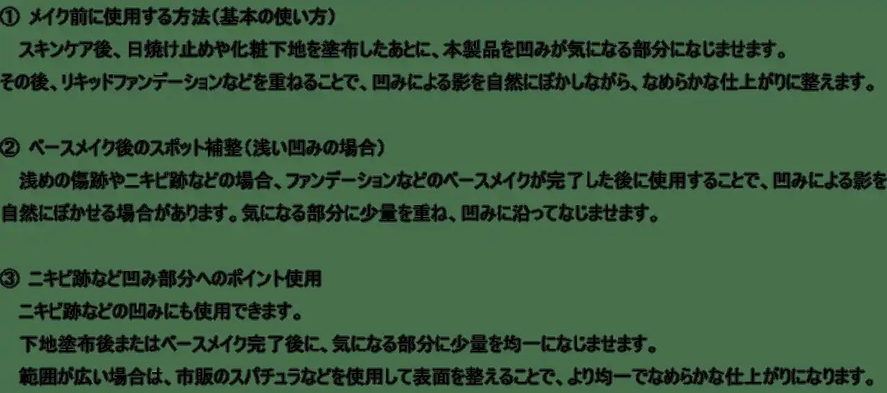 特別なテクニックは必要なく、普段のメイクに手軽に取り入れることができます。厚塗りになりにくく、凹みをカバーしながら自然な仕上がりのメイクをサポートします。 |