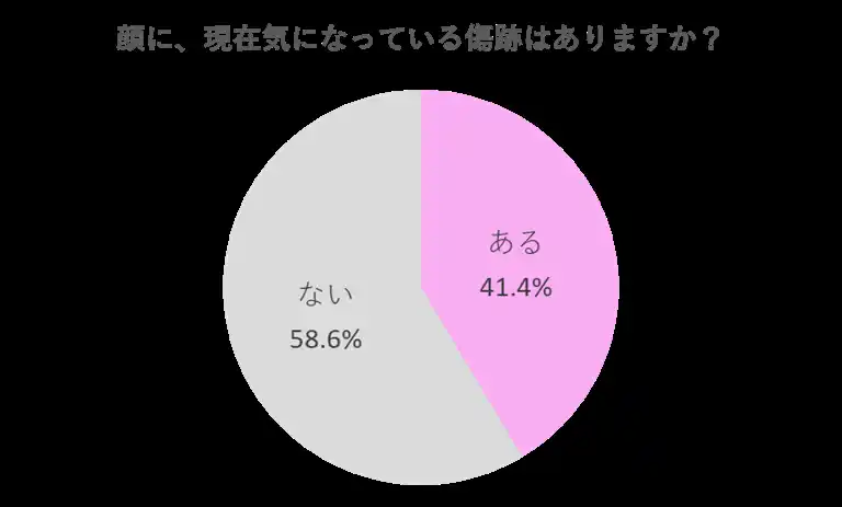 調査対象の41.4%(575名)が、ケガ・やけど・手術・ニキビ・皮膚疾患などによる傷跡が顔に残っていると回答。20~40代の女性のおよそ2人に1人弱が傷跡を抱えているという実態が示されました。 |