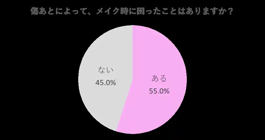 傷跡を持つ女性の55%が「メイク時に困ったことがある」と回答。具体的な悩みとして最多は「メイクをしても隠れない」(38.3%)でしたが、「凹凸が目立つ」(24.0%)、「ファンデーションが均一にのらない」(18.6%)など、凹み特有の悩みが上位を占めています。こうした凹み関連の悩みは合計で全体の約半数を占めており、既存の化粧品では対応が難しいと感じている領域があることが示されました。 |