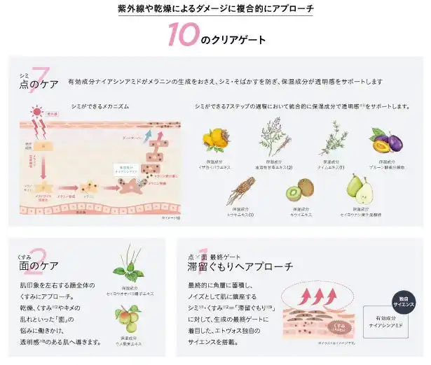 1箇所1成分だけで効かせるのではなく、10のクリアゲート※6を設け、「点」だけではなく「面」にも、ひとつひとつ丁寧にアプローチ。敏感肌でも、シミ※1やくすみ※2の複合的なお手入れが叶います。 |