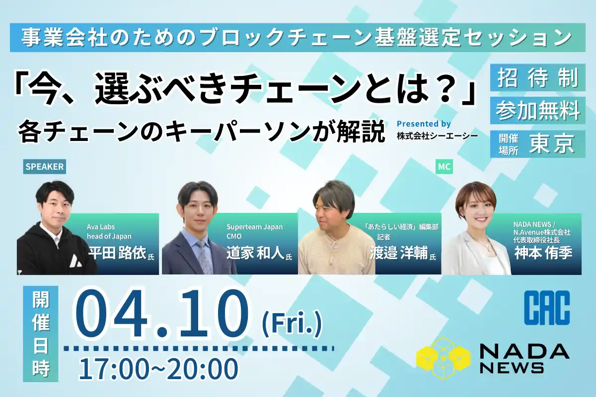 N.Avenue株式会社(本社:東京都港区、代表取締役社長:神本侑季)は、株式会社シーエーシーの協賛により、Web3活用を検討する企業に向けて、最適なブロックチェーン基盤の選定基準を提示する完全招待制ワークショップ「今、選ぶべきチェーンとは? ──事業会社のためのブロックチェーン基盤選定セッション」を、2026年4月10日(金)に開催します。 |