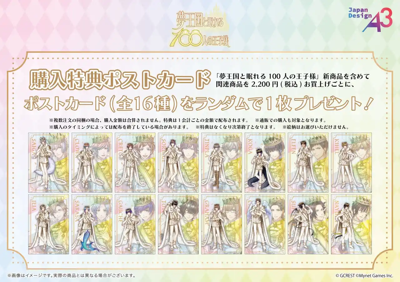 | 『夢王国と眠れる100人の王子様』新商品を含めて関連商品を1会計2,200円(税込)お買い上げごとに、購入特典としてポストカード(全16種)をランダムで1枚プレゼント! | |||||||||